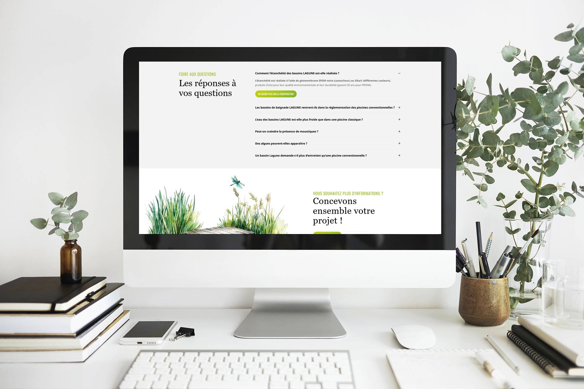 La page de réalisations, la FAQ et la section avant/après — qui montre la transformation d’un jardin ordinaire en véritable écrin aquatique — sont particulièrement soignées, car ce sont les contenus qui font basculer un prospect hésitant vers une demande de devis.