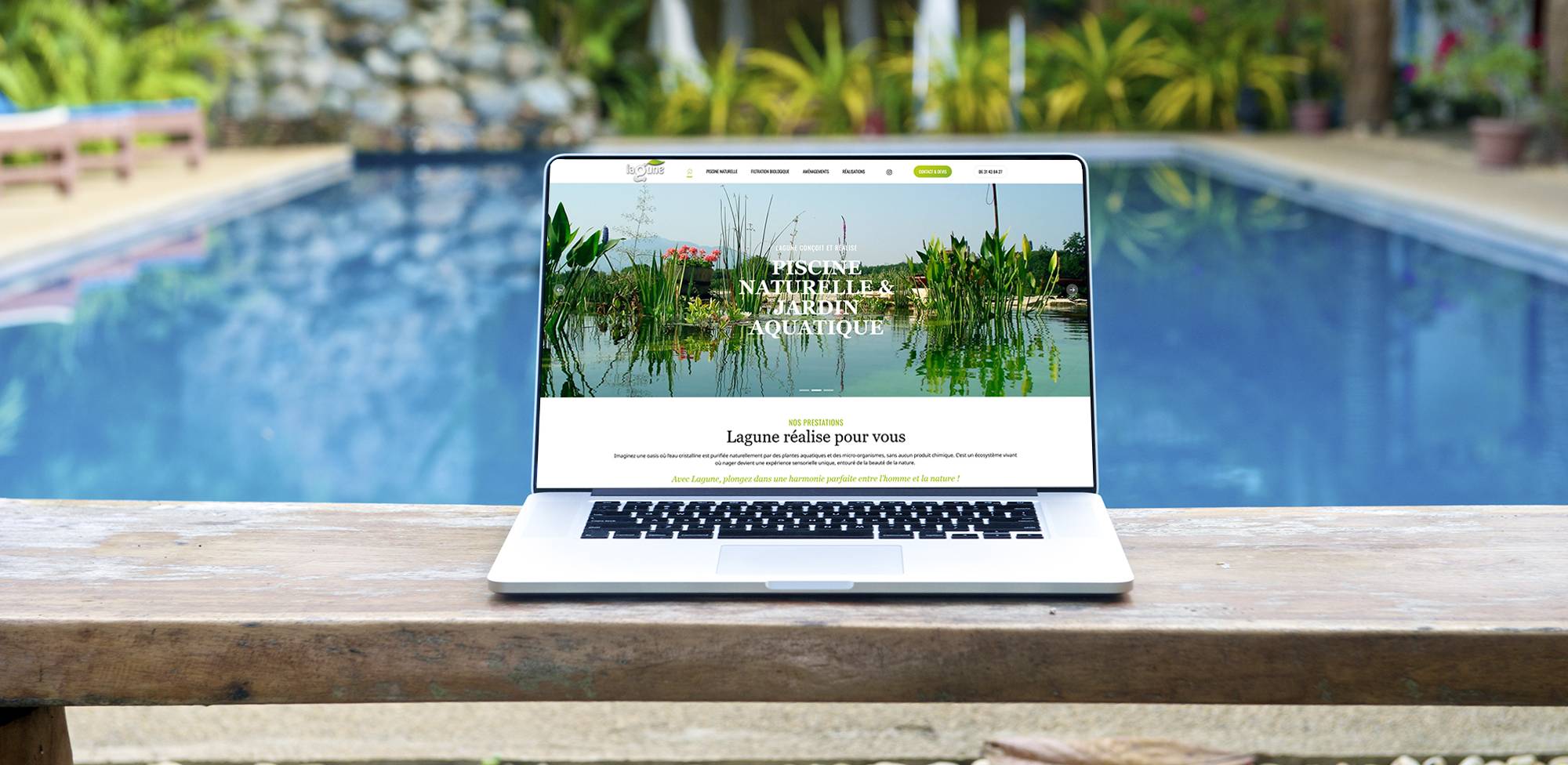 Le parti pris graphique a été clair dès le départ : laisser la place à l’image. Les piscines naturelles de Lagune sont visuellement saisissantes — eau cristalline, végétation luxuriante, intégration paysagère soignée. Le site devait le montrer avant de l’expliquer. J’ai donc construit une mise en page aérée, avec de larges visuels en pleine largeur, une typographie discrète qui ne concurrence pas la photographie, et une palette de couleurs sobre qui laisse toute la vibrance aux photos.