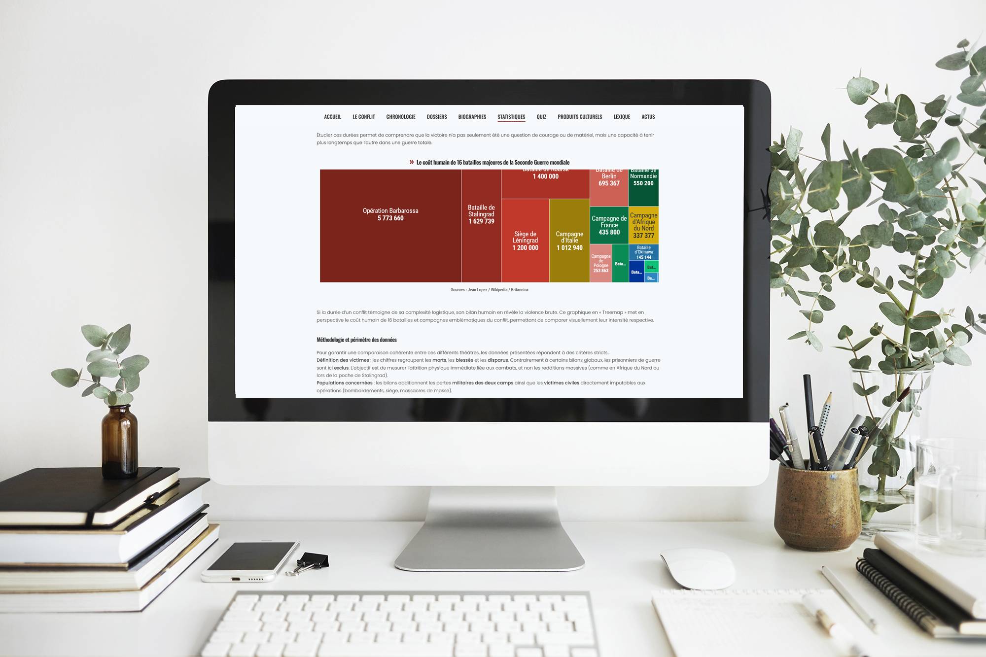 Le défi principal de ce projet n’était pas seulement technique : il était avant tout éditorial et architectural. Comment organiser un volume de contenu aussi dense — des dizaines de biographies, des dossiers thématiques, une chronologie complète, des statistiques, des quiz — de manière à ce que le visiteur s’y retrouve immédiatement et ait envie d’explorer ? La réponse est passée par une arborescence très travaillée, avec des rubriques clairement délimitées et à plusieurs endroits des Call to action qui incitent l’internaute à aller explorer d’autres parties du site.